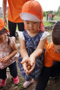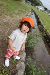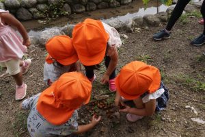 カエルやサワガニなど、色々な生き物が遊びに来てくれるので、