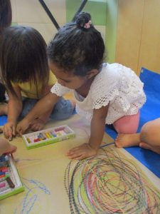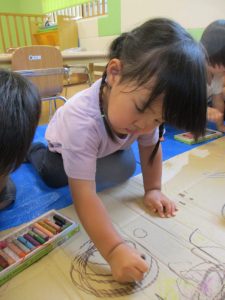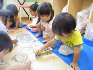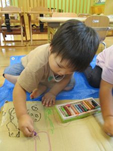 いつもの画用紙とは違いざまざまな素材に絵を描く経験もとても大切なこと