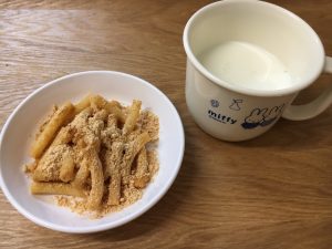 ※今日のおやつは、定番のマカロニあべかわです。茹でたマカロニに、きなこ砂糖をまぶして出来上がり♪簡単に作れて美味しいのでお勧めです。