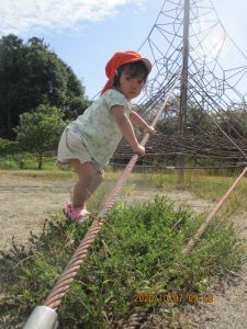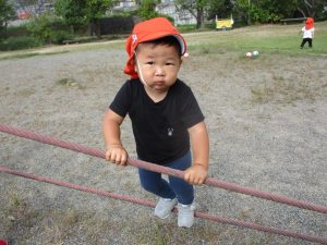 今では保育者がそばで見守る中で、こうして自分で縄につかまって