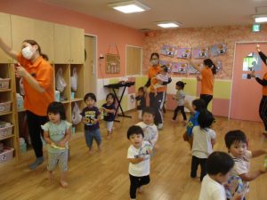 子どもたちに負けないくらい保育者たちもノリノリです![]()