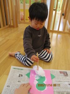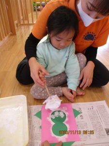 リースの上に雪だるま型の画用紙を置き、その上から白い絵の具を付けたタンポでスタンピングしていきます![]()