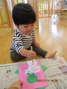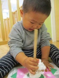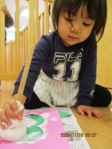 保育者が側で『ポンポン』と言いながら一緒になって楽しんで取り組んでいました(≧▽≦)