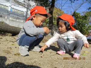 保育園の園庭にも子どもたちが拾ってきてくれた自然物があり、