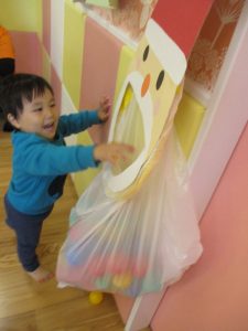 ボールを食べ物に見立てて、?さんの大きなお口に食べさせてあげるというゲームです