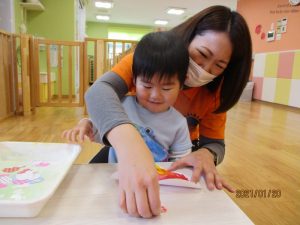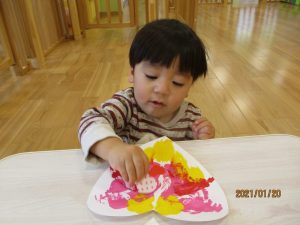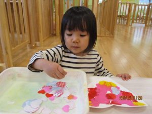以前絵の具で色付けした画用紙に、ハート型の色紙を貼り付けていきます