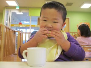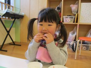 たくさん遊んでこの日のおやつは、『豆腐ドーナツ?』でした