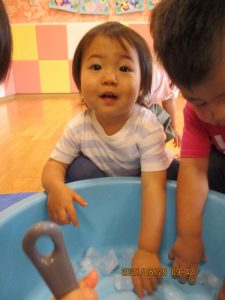 室内にブルーシートを敷きタライの中に氷を入れ氷遊びを楽しみました