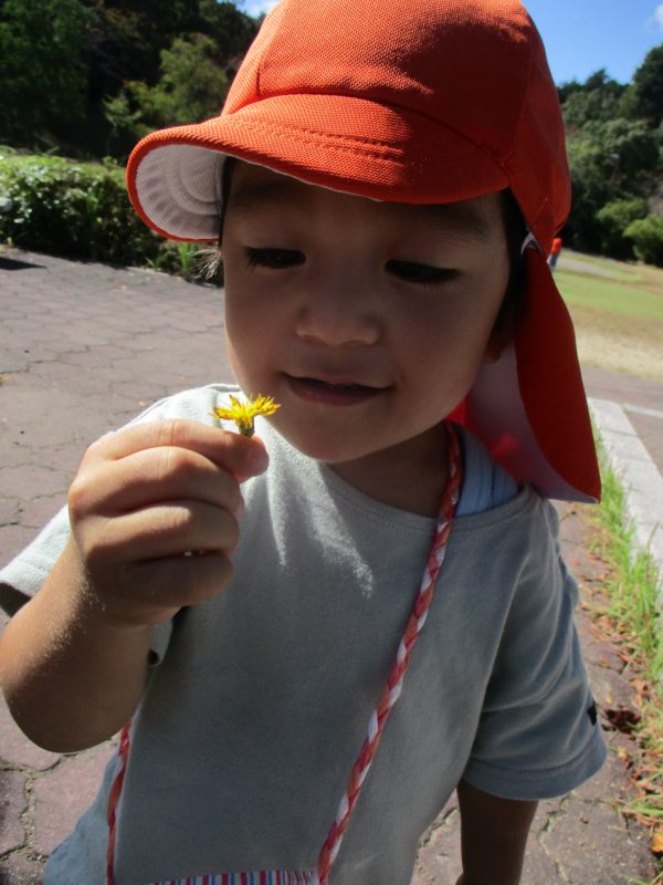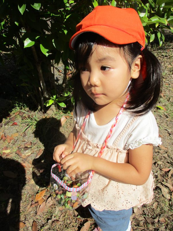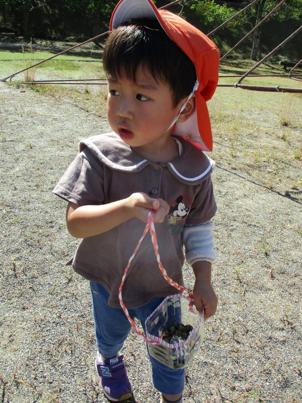 公園で見つけたドングリを興味津々で見つめる姿が可愛い