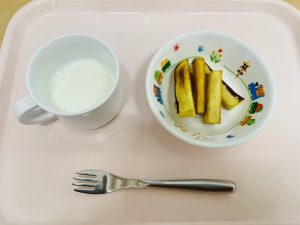 ※今日のおやつは、旬のさつま芋を使用した「さつま芋スティック」でした♪素揚げしただけのシンプルな料理ですが、子どもたちには人気のおやつです。