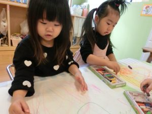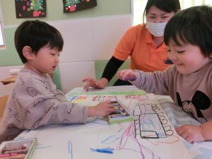 保育者も一緒になってお絵描きを楽しみながら