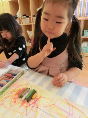クレパスを目の前にして何色にしようか悩んでいる?ぐみさん![]()