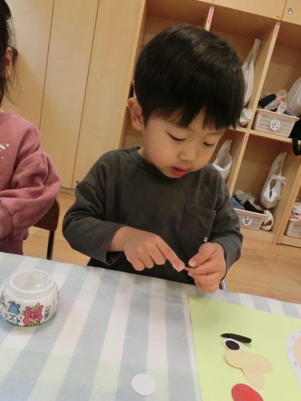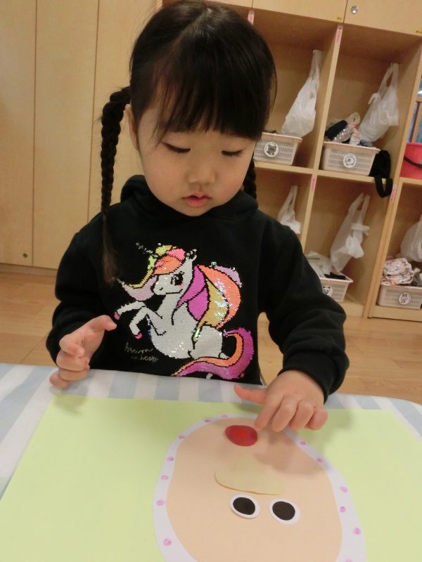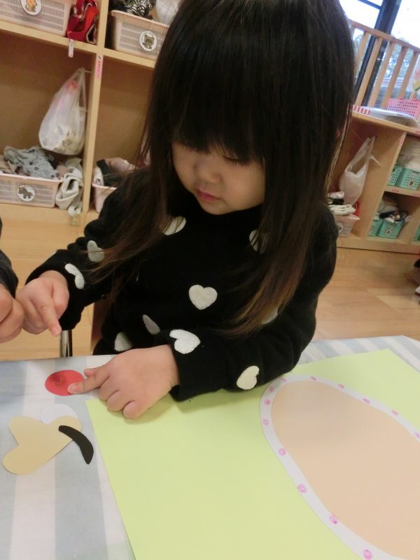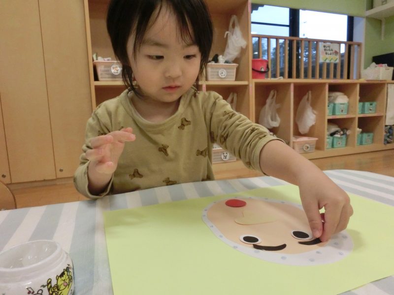 何もない顔の所に眉毛・目・口をのりを使って貼っていきます![]()