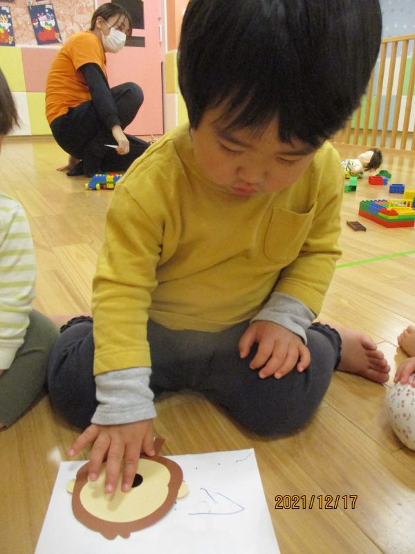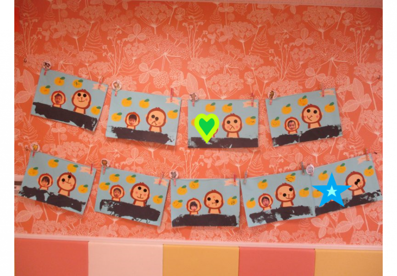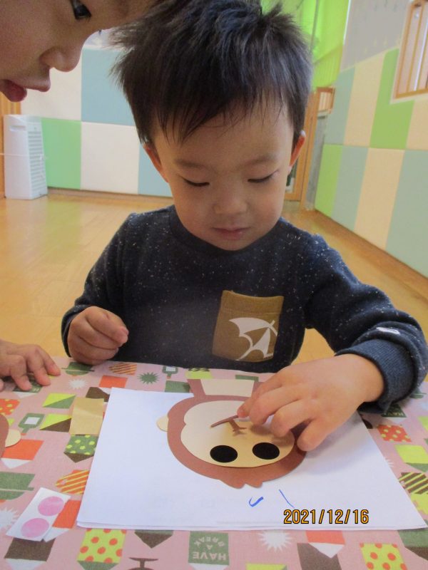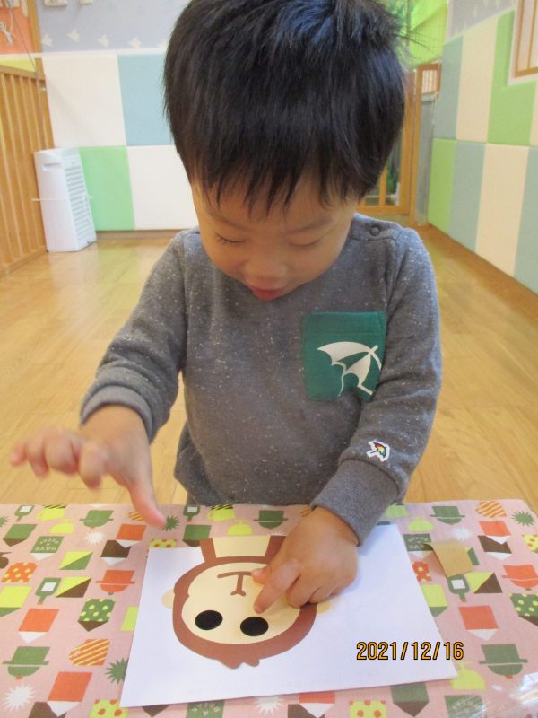 お猿さんの顔のパーツは自分たちで場所を考えながら貼ってくれたということで、