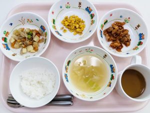 ご飯 味噌汁 若鶏のケチャップ煮 ツナポテ煮 コーンソテー