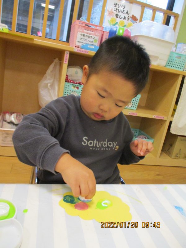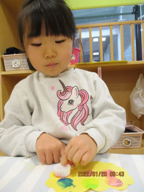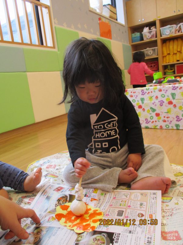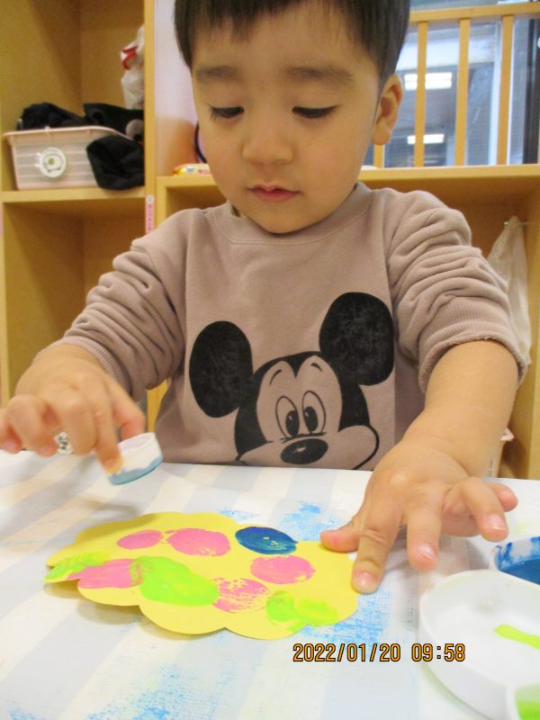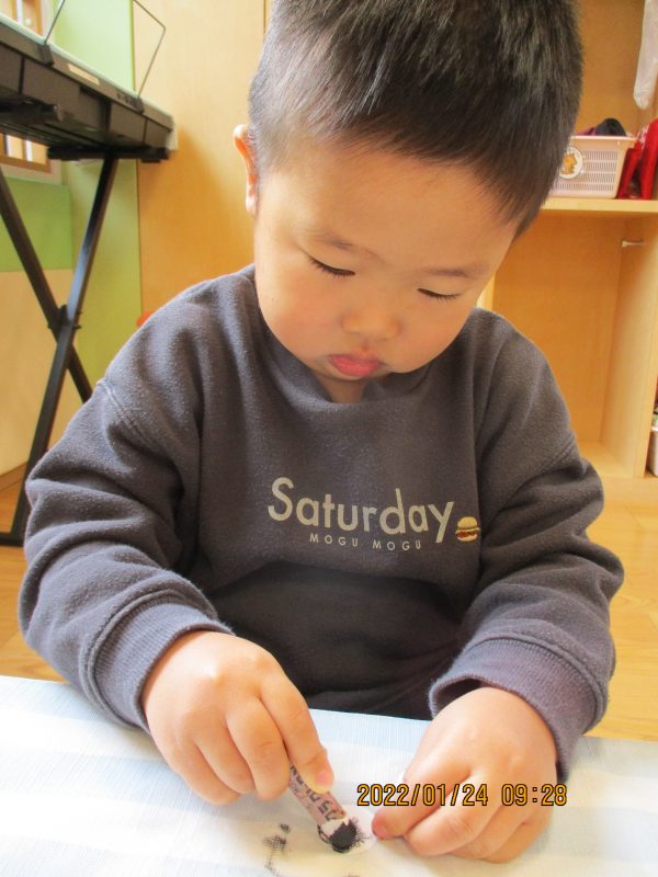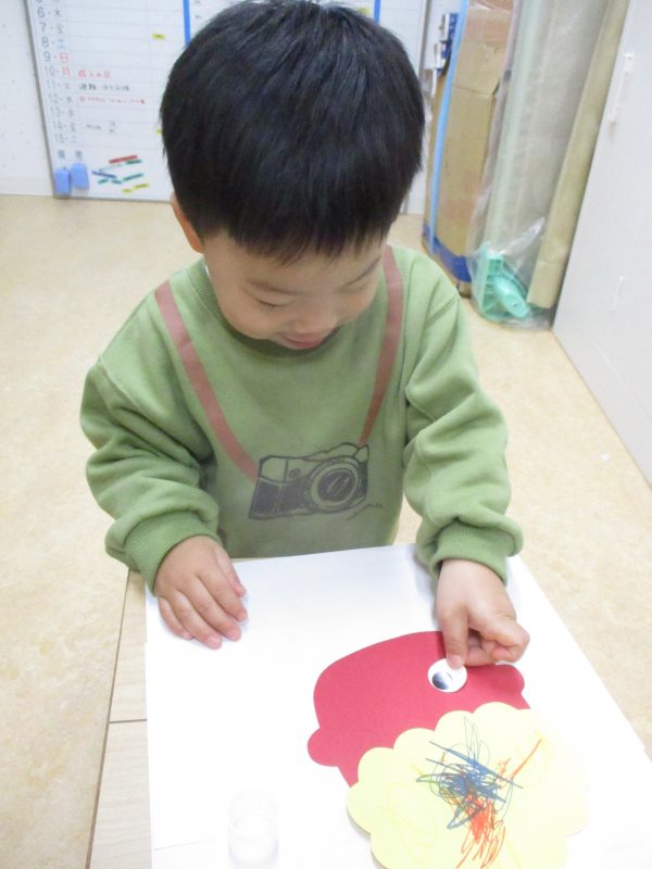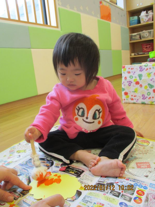タンポに絵の具を付けて鬼の髪の毛をオレンジ色にさせましたよ![]()