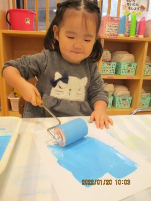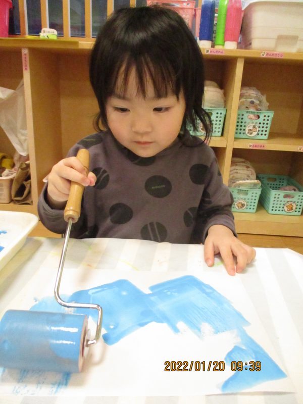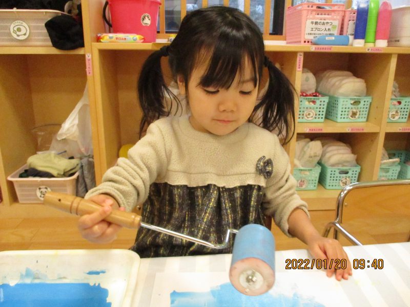 白い紙にローラーを使って色付け作業![]()
