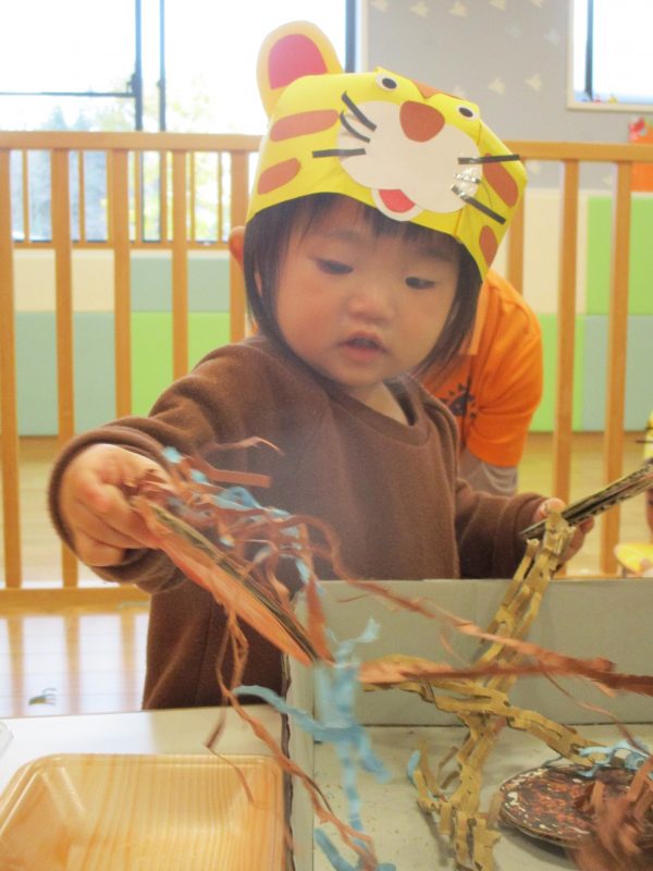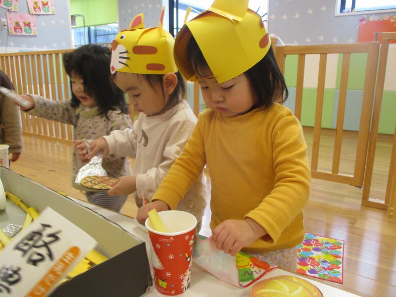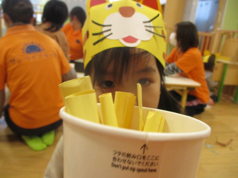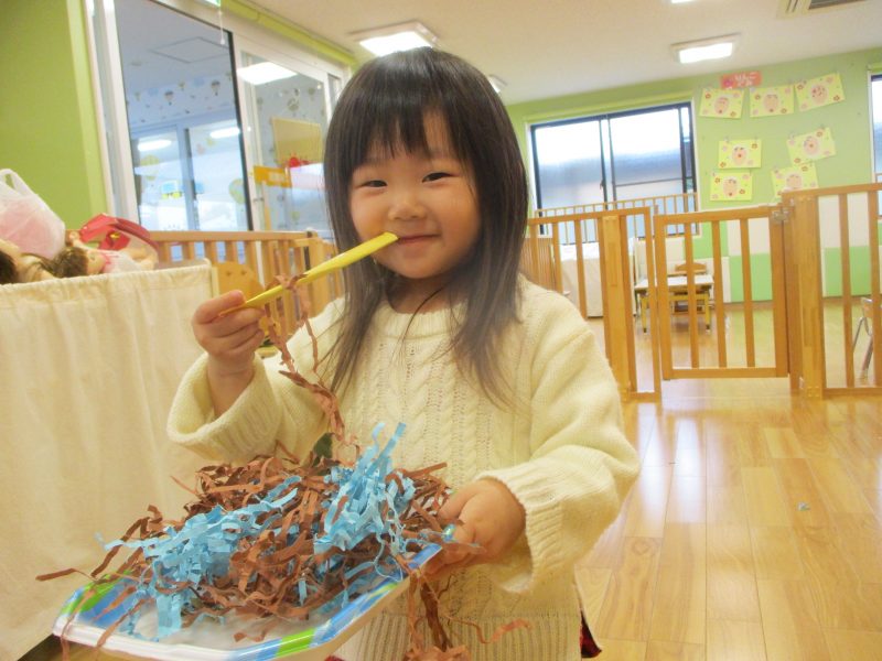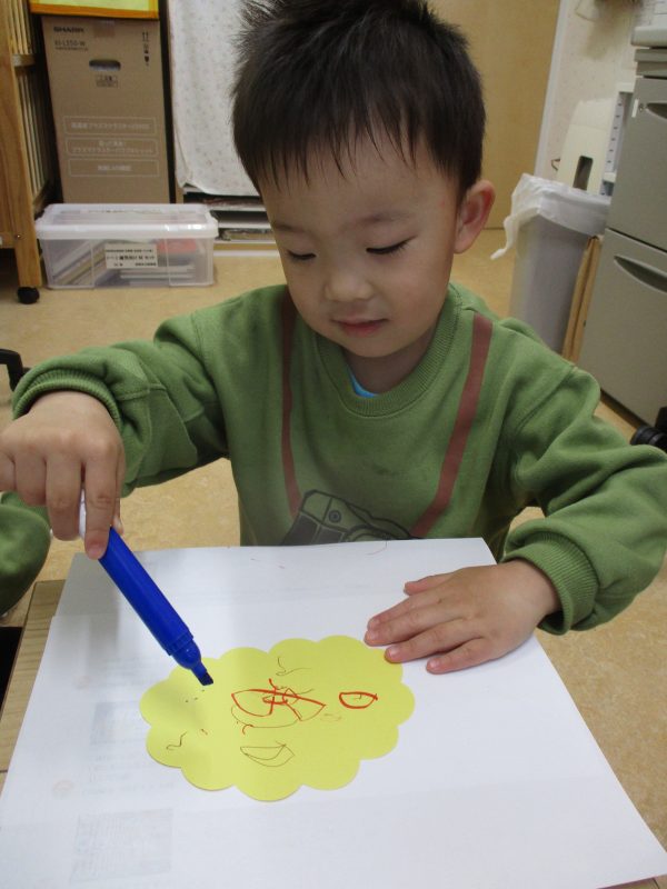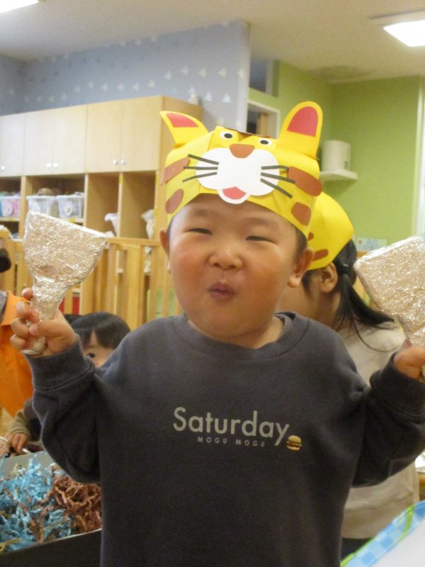 保育園では節分会に向けてクラス毎にお面を作りをしました。