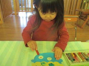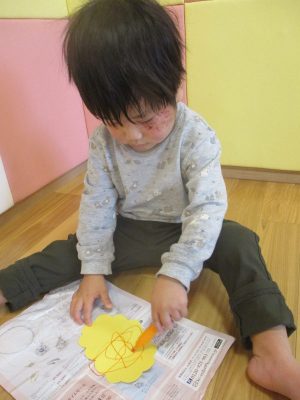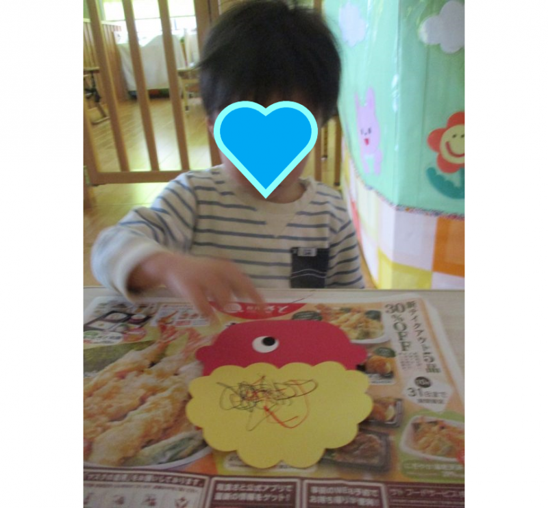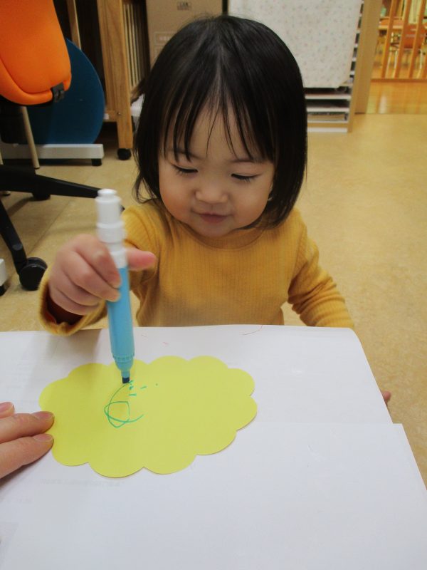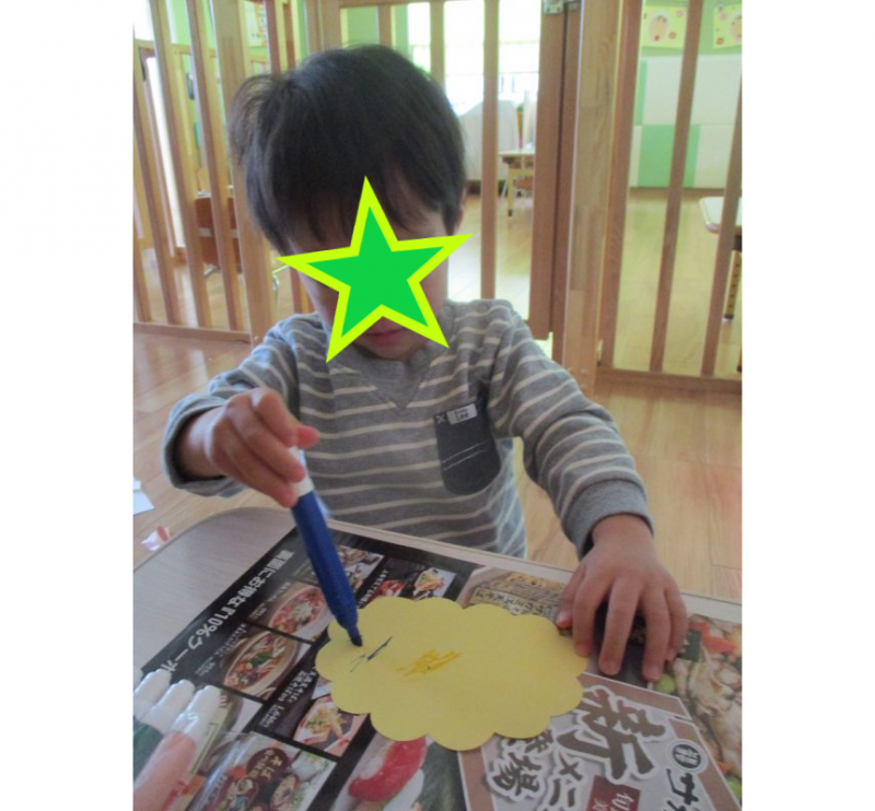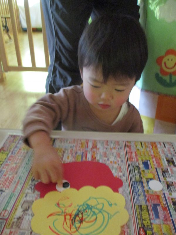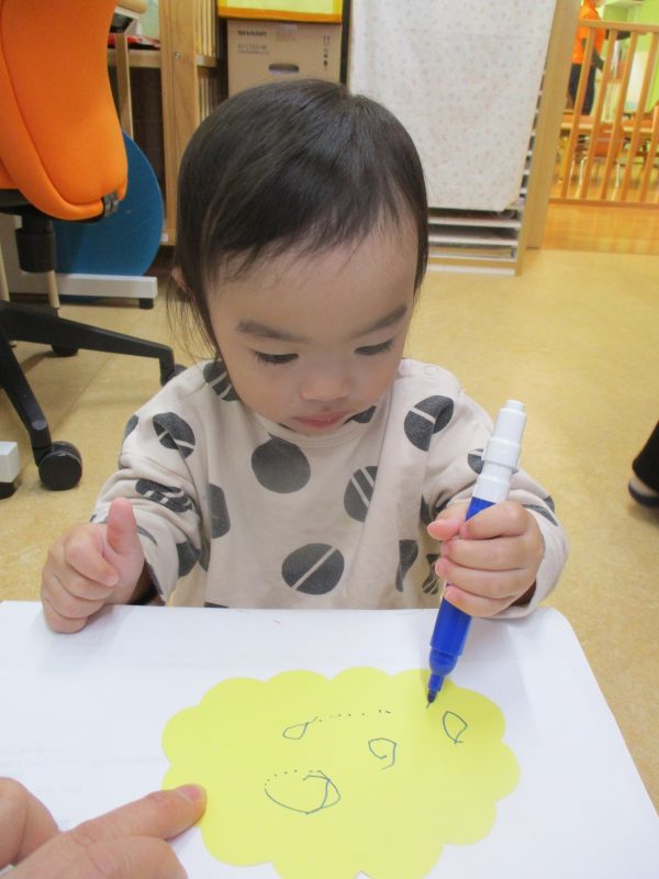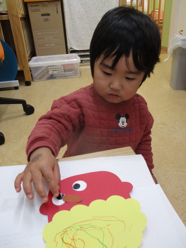 クレパスで目・鼻・口を描くよ~![]()