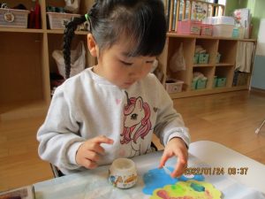 ペットボトルのキャップに絵の具をつけて