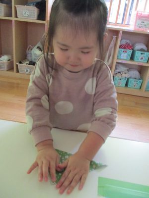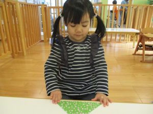 折り紙のお山とお山をくっつけて三角に折ります![]()