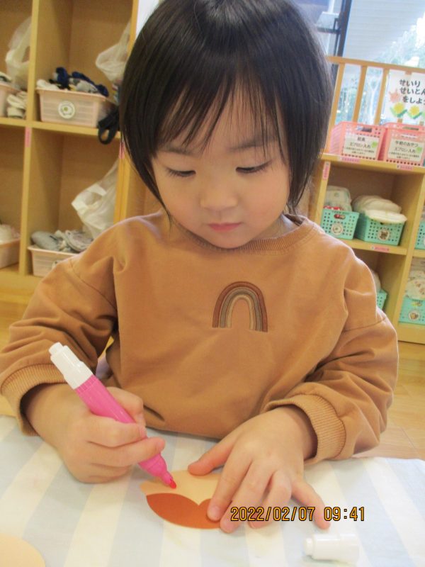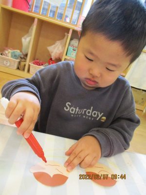 次は自分の好きな色のペンで目や口を描いていくよ![]()