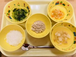 粥 味噌汁 鶏ひき肉のくず煮 じゃが芋煮 キャベツのおかか煮