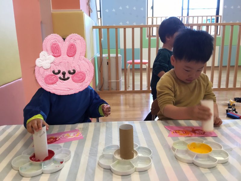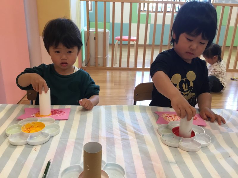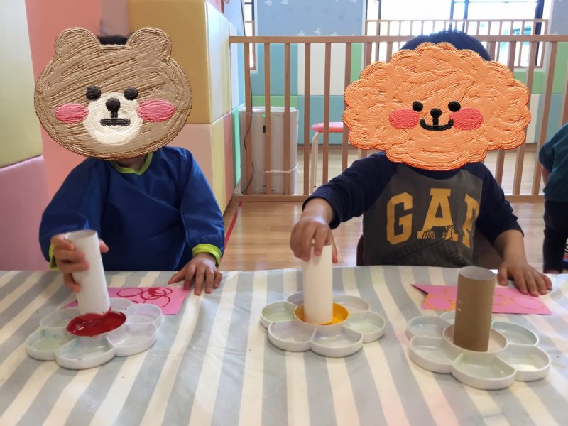 絵の具とトイレットペーパーの芯を使ってスタンプをしました✨
