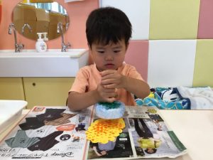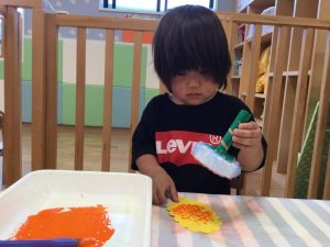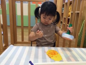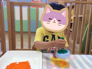 シールを貼ったりスタンプをしたりフィンガーペインティングとさまざまな擬法で製作を楽しみました♫
