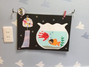 手形は可愛い金魚に変身しおともだちも一緒に金魚鉢の中を泳いでくれています