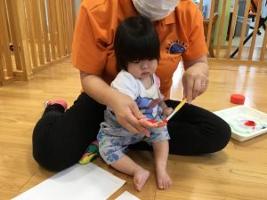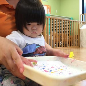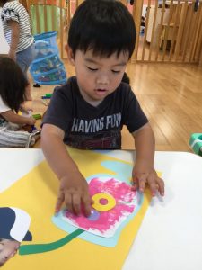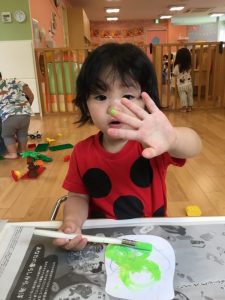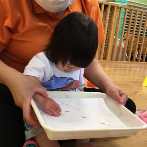 手に赤い絵の具をつけるとグー✊パー✋しながらにゅるにゅるした感触を楽しんでくれました♡