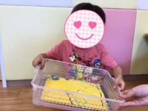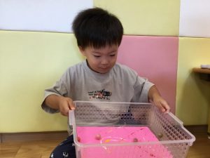 次はビー玉転がしに挑戦☺️保育者と一緒に箱を持ってコロコローと思ったら✨