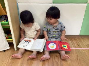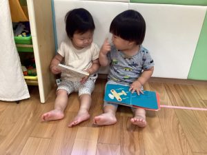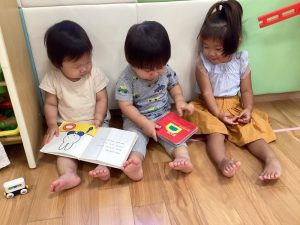 お友だちと一緒に座ってみる絵本もとってもおもしろいね