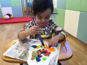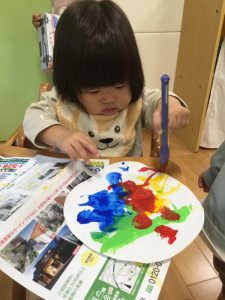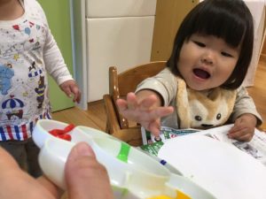 絵の具を見ると「早くしたーい😆」と手を伸ばしてくれました🎨✋