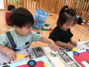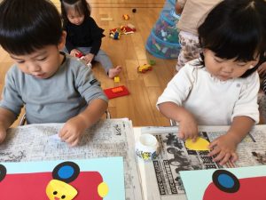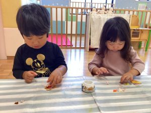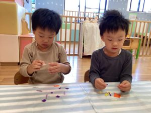 小さく切ってある折り紙でしたが、指先を上手に使いさらに小さくたくさんちぎることができました👏