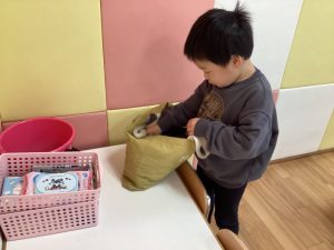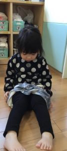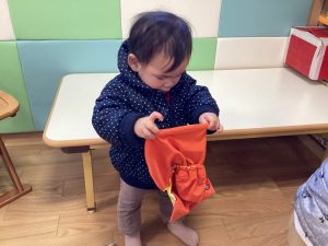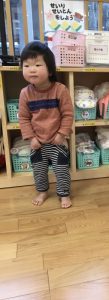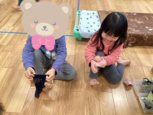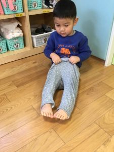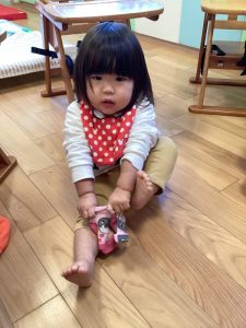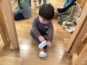 今では園庭に出る際には自分で靴下入れから靴下を取り自分で履いて、