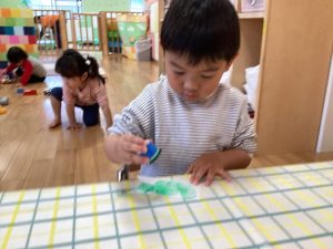 ペットボトルのキャップを使ってスタンプをしこいのぼりに模様をつけました🎏