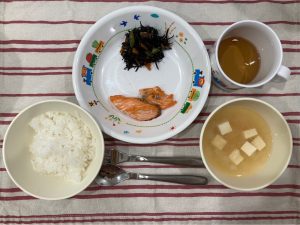 ご飯 味噌汁(玉ねぎ・豆腐) 鮭の塩焼き ひじきのいり煮