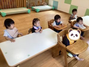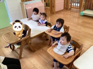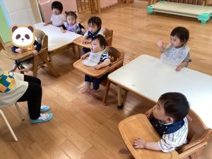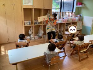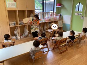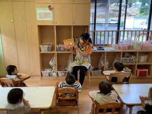 今週の絵本ブログはいちごぐみさん、ももぐみさんが「おしくらまんじゅう」の絵本を見ているところをお伝えしたいと思います😊