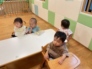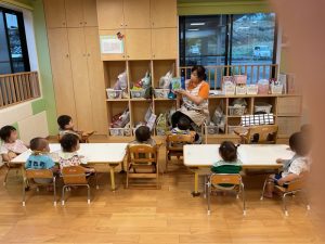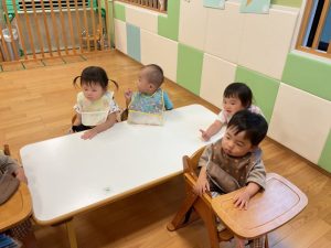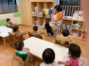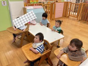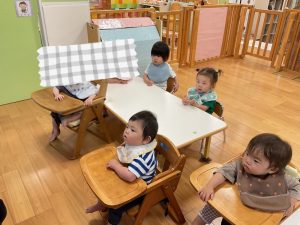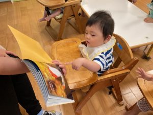 今週の絵本ブログはいちご組さん、もも組さんが「あっちむいて ほい」の絵本を見ている様子をお伝えします🐟