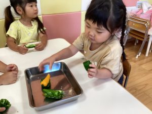 『野菜に興味をもつ』を、ねらいに野菜の切る前と半分に切った断面の様子を観察しました🫑