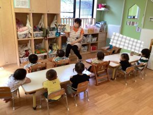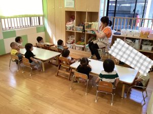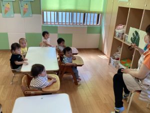 今週の絵本ブログはもも組さんといちご組さんが「わにわにのおおけが」の絵本を見ている様子をお伝えします📙