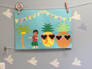 つけた模様はパイナップルに🍍変身✨横にはかわいい衣装に着替えてフラダンスを楽しんでいるお友だちの姿が✨