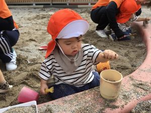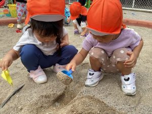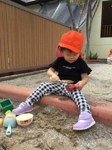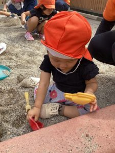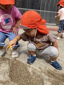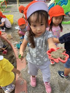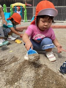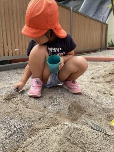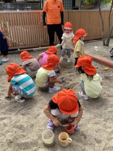 お山づくりのほかに砂場ではご飯作り🍚で忙しそうなお友だちが🥰