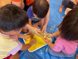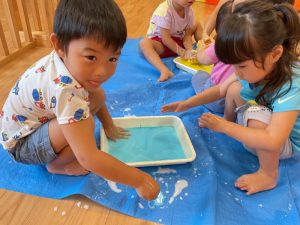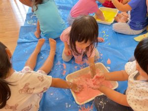 みんな手で触ったり、指でつまんだり、全身片栗粉粘土だらけになって楽しみました😄