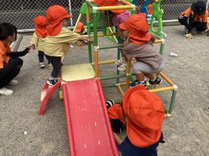 りんご組さんは「今日はお外で遊ぼう😆」と先生が話すと