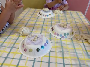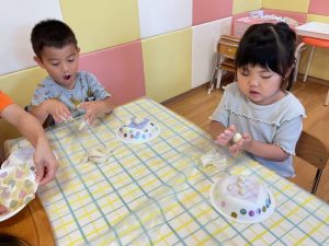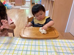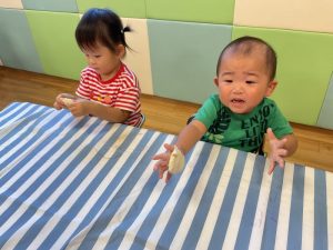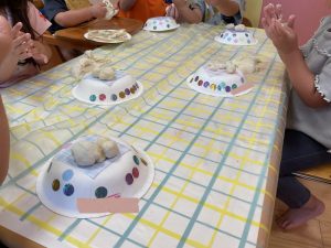 小麦粉粘土手に取って丸めたり、ちぎったりしていくよ😊