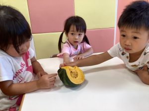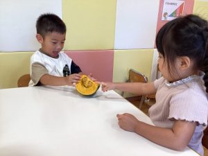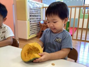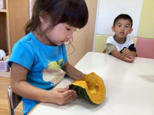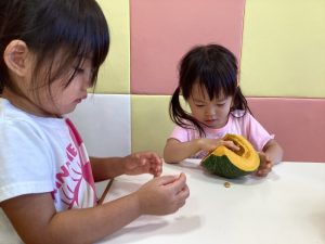 かぼちゃの種を触ったり、色の違いを感じたり、かぼちゃのにおいをかいだりしましたよ🎃