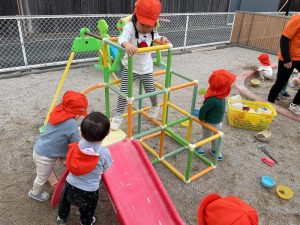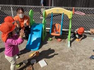 日中、天気がよくなくて園庭に出れなくても夕方、園庭で遊べることがわかると「いえーい🙌」と大喜びです😊