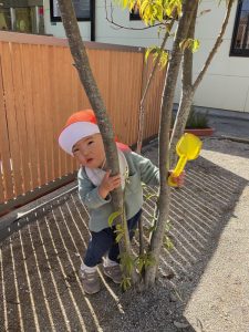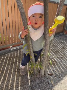 砂場の近くの木に隠れているお友だちを見つけましたよ😍